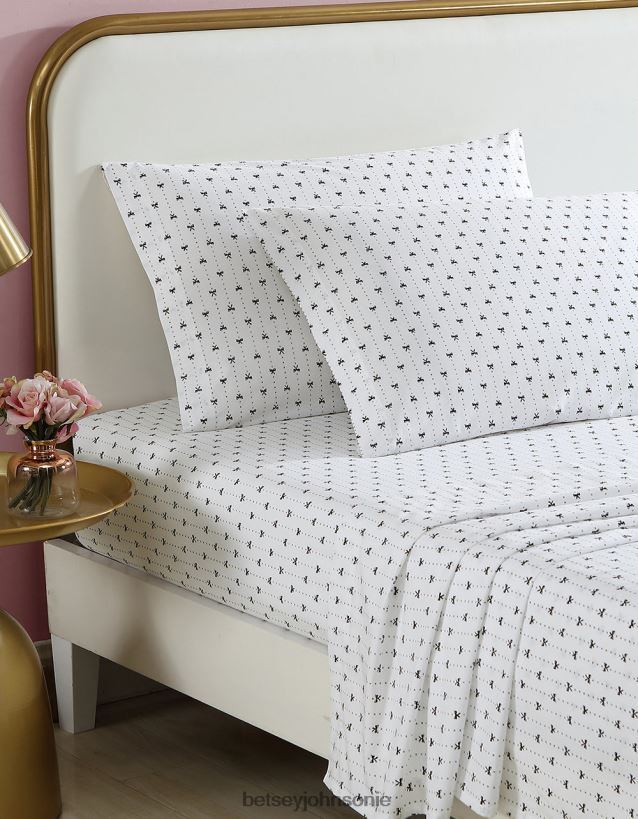 The Betsey Johnson ribbon pinstripe sheeting decor features linear pinstripes made of delicate ribbons in black on white ground. Made of 100% cotton, they are easy to maintain. Threads are woven in a tight weave to ensure smoothness on all sets. The single ply sheets are woven to be lightweight, yet durable. They are constructed with a percale weave for a cool feel using 200 thread count. Each set includes a flat sheet, elastic fitted sheet and 2 pillowcases. (1 for twin size).