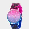 The stylish BETSEY TIME HEARTS ABOUND watch features a multi-colored graffiti heart-watch band and a pink dial face, providing a fashionable look that can match with almost any outfit!