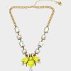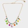 Glistening lavender tennis necklace featuring playful butterfly and bug motif mixed charms at front. Adorned with minimal stone accents, turquoise cabochons, and lustrous pearls. Necklace has an adjustable lobster clasp closure. Made from polished metal, glass, enamel, faux pearl, and semi-precious turquoise.