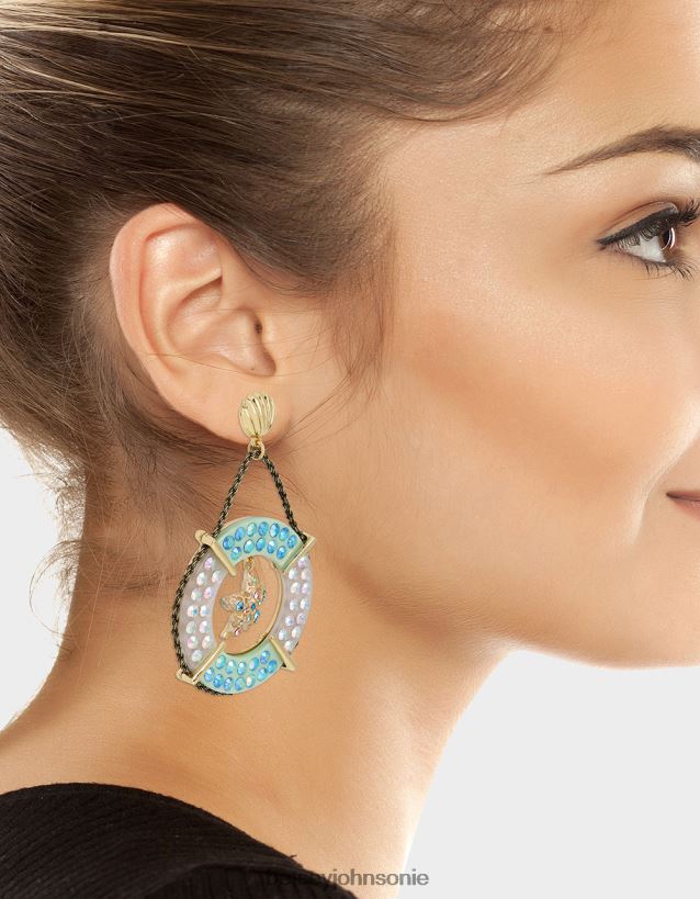 Statement earrings featuring seashell stud paired with dangling lifesaver adorned with playful starfish charm and colorful mixed stone accents. Earrings have a post back closure. Made from polished metal, glass and plastic.