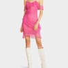 Turn up the heat in this denim mini dress that has a corset-style bodice with zipper front closure. This chic mini dress also features adjustable spaghetti straps and a pink floral print.