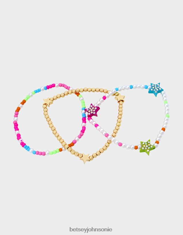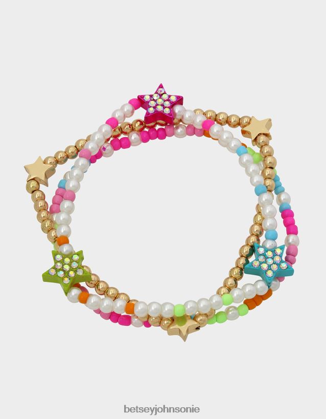 Stretch bracelet set featuring lustrous pearls and colorful seed beads and mixed stars. Adorned with minimal stone accents. Set includes 1 gold beaded bracelet and 2 mixed beaded bracelets to mix and match with easy stretch closures. Made from polished metal, glass and faux pearl.